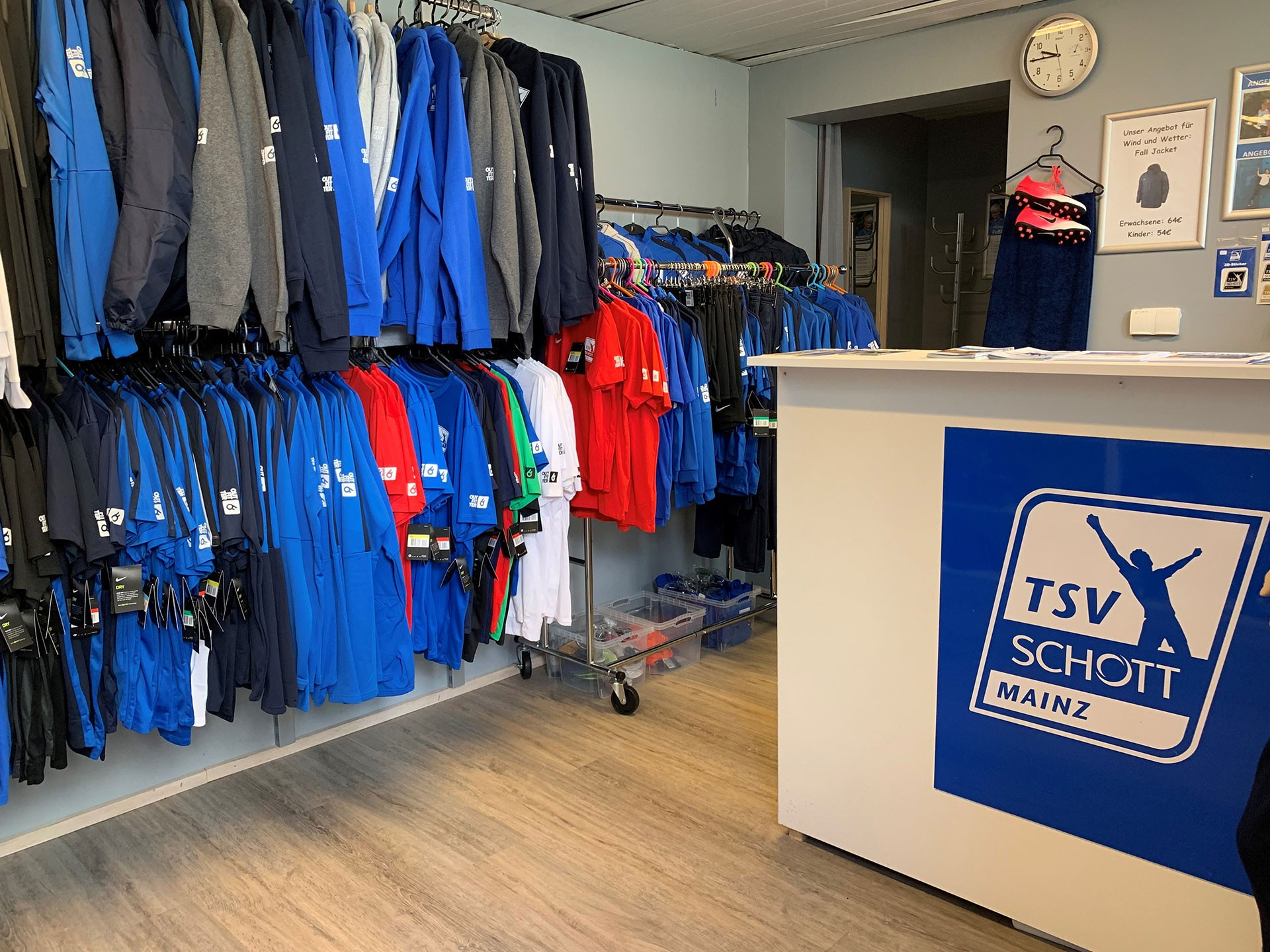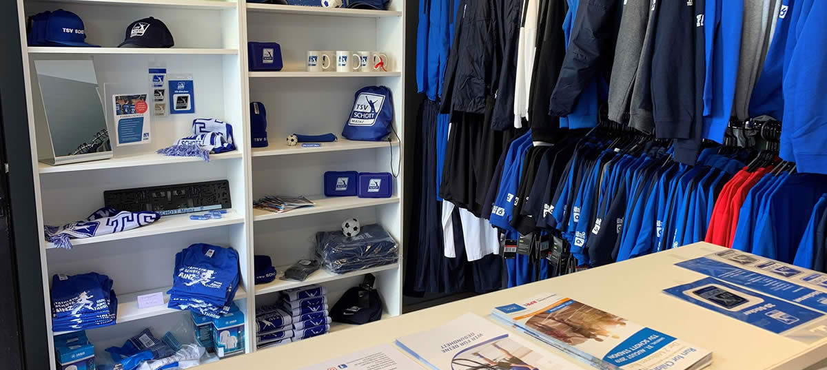 Im FanShop in der Karlsbader Straße 23 bietet der TSV SCHOTT Mainz praktische Trainingsoutfits und stylische Sportkleidung von Nike, auch erhältlich ohne Vereinslogo, an. Ebenso finden Sie tolle Geschenkideen wie Sportbeutel, Kinderrucksäcke, Trinkflaschen, Federmäppchen, Kappen, Fanschals sowie Tassen mit Vereinslogo. Einfach mal reinschauen, unser Team berät Sie gerne.